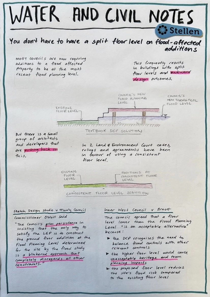 Most councils are now requiring additions to a flood affected property to be at the most recent flood planning level. This frequently results in buildings with split floor levels and awkward design outcomes.